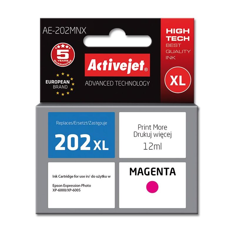 Caratteristiche Tecnologia di stampa: Stampa a getto d'inchiostro Sostituzione per: Epson 202XL Colori di stampa: Magenta< li>Compatibilità del marchio: Epson Tipo di inchiostro: Inchiostro a base di coloranti Quantità per confezione: 1 pezzo/i Numero di inchiostri a colori cartucce:1 < li>Volume inchiostro a colori: 12 ml Capacità cartuccia: Rendimento elevato (XL) Tipo di consegna: Al pezzo < li>Codice OEM: Epson 202XL H34010 Tipo:Compatibile Descrizione del prodotto:Cartuccia d'inchiostro Activejet Tipo di inchiostro a colori: Inchiostro a base di coloranti Peso e peso dimensioni Tipo imballo:Scatola Altre caratteristiche < li>Classe:A+ Versione:Supreme Tecnologia:Nuovo Descrizione del prodotto:Cartuccia d'inchiostro Activejet Informazioni aggiuntive:Cartuccia con chip