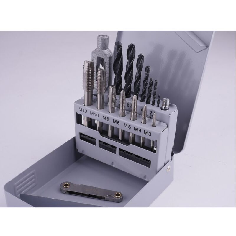 Questo set di forcini per rubinetti a taglio HSS consente un taglio conforme a standard di filettature interne di M3-M12. Il rubinetto da taglio con taglio peeling tagliare il filo in una sola operazione. Il ferro del vento regolabile appropriato colpisce saldamente il quadrato del rispettivo hooper filettato. Con il modello filettato anche contenuto, è possibile misurare la pendenza.