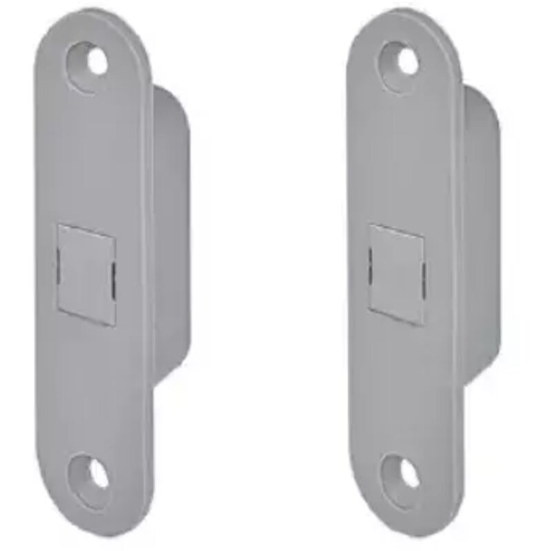 Kit formato da due contropiastra magnetica EASY-TOUCH in materiale plastico con bordo tondo di cui uno ha un coperchio di colore rosso per identificare la polarita' inversa in finitura grigio RAL7036. Compatibile con le fresate per incontri easy-matic e easy-fix di larghezza mm.22x82 e spessore 2.2mm.