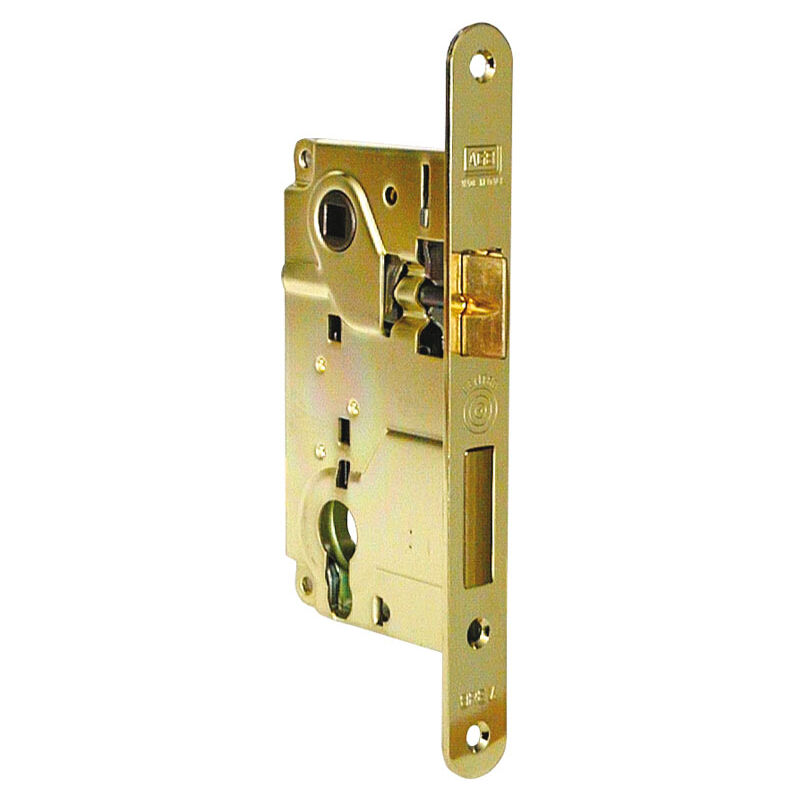 Serratura da infilare. 2 mandate e scrocco, in acciaio ottonato verniciato.