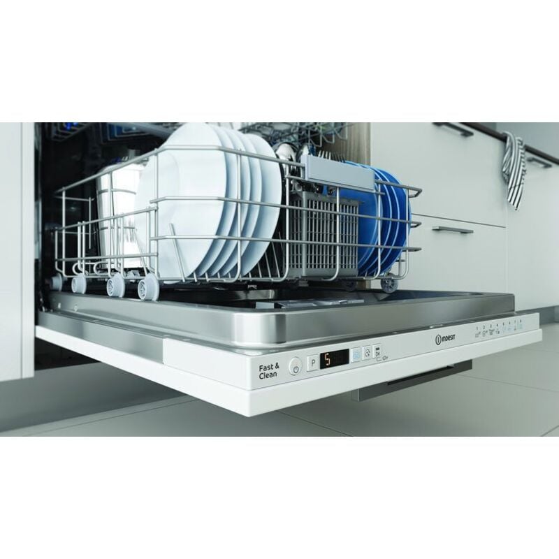 Indesit I3I D534A. Posizionamento dell'apparecchio: A scomparsa totale, Dimensione: Dimensione massima (60 cm), Tipo di controllo: Pulsanti. Numero di coperti: 14 coperti, Classe emissione rumore: B, Emissione acustica: 44 dB. Classe efficienza energetica: D, Consumo di acqua per ciclo: 9,5 L, Consumo energetico per 100 cicli: 85 kWh. Larghezza: 598 mm, Profondità: 555 mm, Altezza: 820 mm. Peso dell'imballo: 37,5 kg