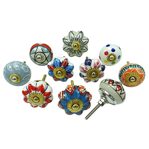 Indian ceramica-unica impresa armadi manici, set 10 pezzi da cucina pulsanti, ceramica, Multi-31, 1.5 "InchesDiamètre