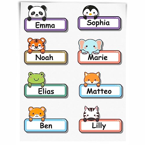 INDIGOS UG - 48 adesivi con nome per bambini, set da 4 - 50 x circa 30 mm - simpatici animali - cartone animato - autoadesivi - personalizzabili - per la scuola - matite, astuccio, righelli