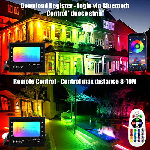 Indmird Faretto LED RGB Esterno 60W, Faro LED Esterno IP66 Impermeabile Proiettori LED, Faretti RGB con Controllo APP Bluetooth e Timer, Luce d'Atmosfera RGB per Festa Natale Giardino Corridoio
