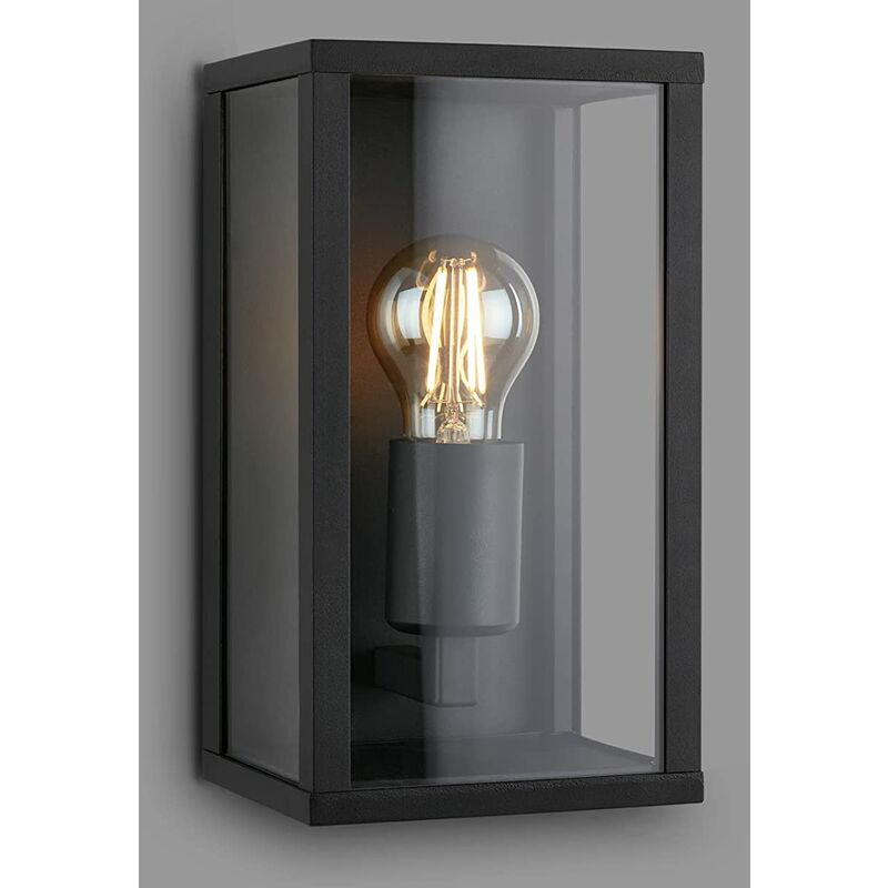 Lampada da esterno resistente alle intemperie in nero con vetro trasparente per parete di casa, vialetto, porta d'ingresso, cortile e garageLa classe di protezione IP44 offre una moderna protezione dagli spruzzi di illuminazione esternaIl vetro trasparente di alta qualità della lampada da giardino è delimitato da robusti bordi metallici e protegge la lampadina E27 da il tempoLa lampada da esterno ha un attacco E27 per una lampadina fino a 12W.La lampadina non è inclusaDimensioni del prodotto della parete luminosa: 260 x 140 x 135 mm (L x P x A)