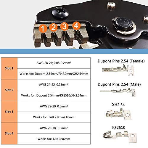 ✔【Gamma di crimpatura】 AWG 28-16 (0,1-1,5 mm²). Può essere utilizzato per connettori JST-XH, Dupont 2.54mm, KF2510, TAB 2,8mm 3,0mm 3,96mm ecc.