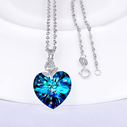 INFINIONLY Collana cuore di cristallo da donna e ragazza, Collana in argento 925, Ciondolo cuore, Pendente in cristallo cuore dell'Oceano, con mini fiore di rosa, zircone, catena da 45cm, blu oceano