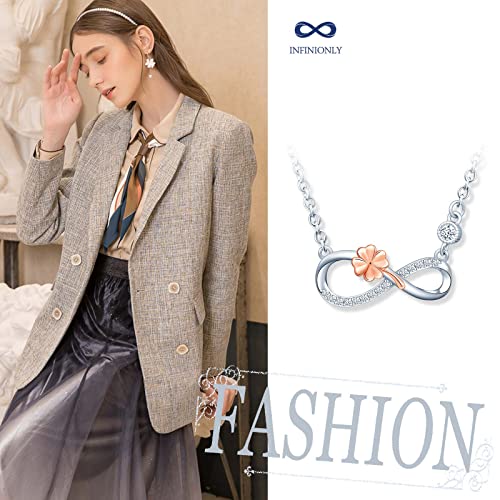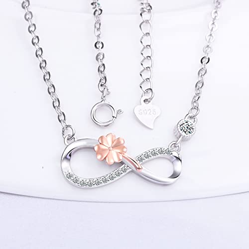 INFINIONLY Collana da donna e ragazza, Collana in argento 925, Collana Ciondolo simbolo dell'infinito in argento intarsiato con quadrifoglio in oro rosa, Zircone, Processo di galvanica bicolore unico