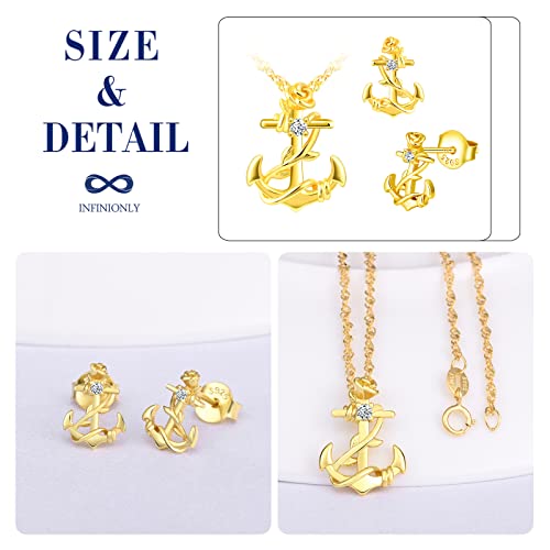 INFINIONLY Collana e Orecchini di ancora da donna ragazza, Parure di gioielli in argento 925, Ciondolo con ancora intrecciata di fiori di rosa, Orecchini con ancora-fiori di rosa, zircone, oro