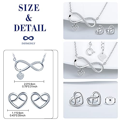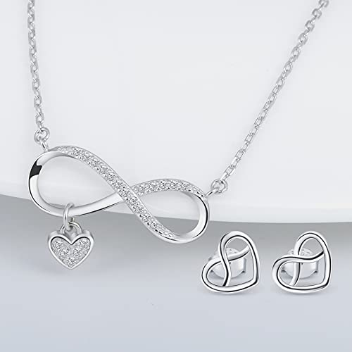 INFINIONLY Parure di gioielli, Collana Orecchini cuore da donna ragazza, orecchini collana in argento 925, orecchini collana ciondolo con simbolo dell'infinito e cuore, zircone intarsiato, argento