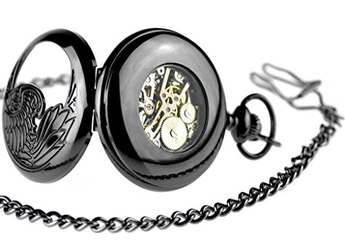 Infinite U - Orologio da tasca meccanico, con numeri romani, motivo: aquila/angelo/fenice, con meccanismo a vista, catena in acciaio, colore nero
