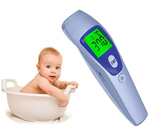 Infrarosso senza contatto termometro digitale bambino molto accurata. Clinicamente testato Nessun contatto richiesto. Avvertimento retroilluminato a 3 colori per l'allarme febbre. I neonati agli adulti. Include animali. Sicuro, facile da usare. ° C o ° F. Deter Mines corpo, latte, bagno e temperatura ambiente, per l'uso in casa, a scuola, ospedale o sul posto di lavoro, intelligente e robusto, nessuna garanzia di rischio. Batterie incluse.