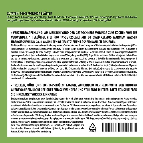 100% NATURALE E PURO: Le nostre foglie di moringa sono prive di additivi, conservanti o aromi - un prodotto naturale al 100%.
