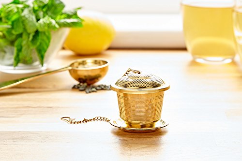 Infusore per il Tè Apace (set da 2) con Cucchiaino da Tè e Piattino Anti-goccia - Filtro & Colino in Acciaio Inossidabile Ultra-Elegante per Un'Esperienza di Infusione Superiore (Oro, Medio)