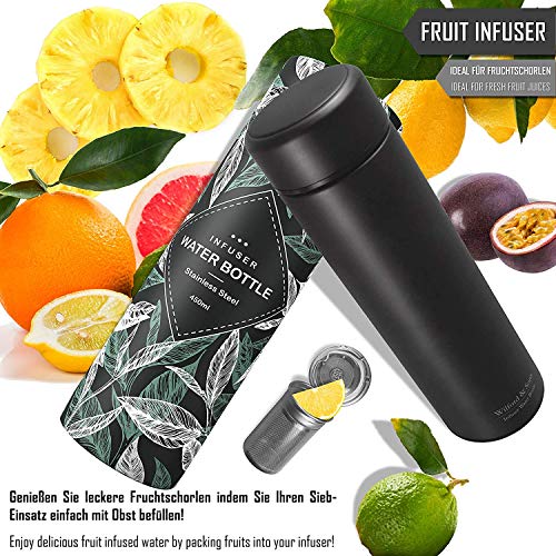 Infusore per tè / frutta e borraccia d'acqua + colino + inserimento per frutta senza BPA | 450ml bottiglia termica in acciaio inox con isolamento vuoto | ufficio, outdoor, scuola, sport - caffè, tè