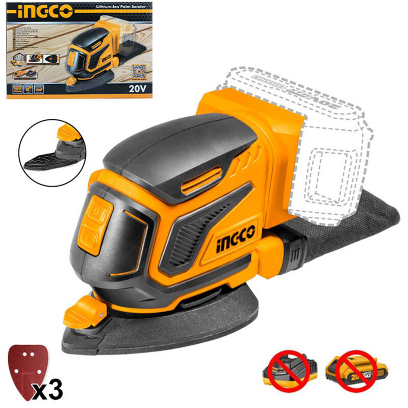 Levigatrice Orbitale A Batteria Ingco CDSLI2051 Con una velocità a vuoto di 13000rpm, questa levigatrice è in grado di affrontare una vasta gamma di progetti di levigatura con efficienza e precisione. Il kit include tre pezzi di carta vetrata, garantendo una fornitura iniziale di materiali abrasivi per iniziare subito i tuoi progetti di finitura. Questo offre una convenienza aggiuntiva, consentendo agli utenti di iniziare a lavorare senza dover cercare immediatamente forniture aggiuntive. La levigatrice è dotata di una piastra per persiane, una caratteristica che la rende particolarmente adatta per la lavorazione di superfici con dettagli intricati o per la levigatura di persiane, dove è necessaria una precisione specifica. La sua costruzione leggera e maneggevole, unita alla maniglia ergonomica, facilita l'uso prolungato senza affaticare l'operatore. Il design compatto e senza cavo consente di muoversi agevolmente durante la levigatura, offrendo maggiore libertà di movimento.