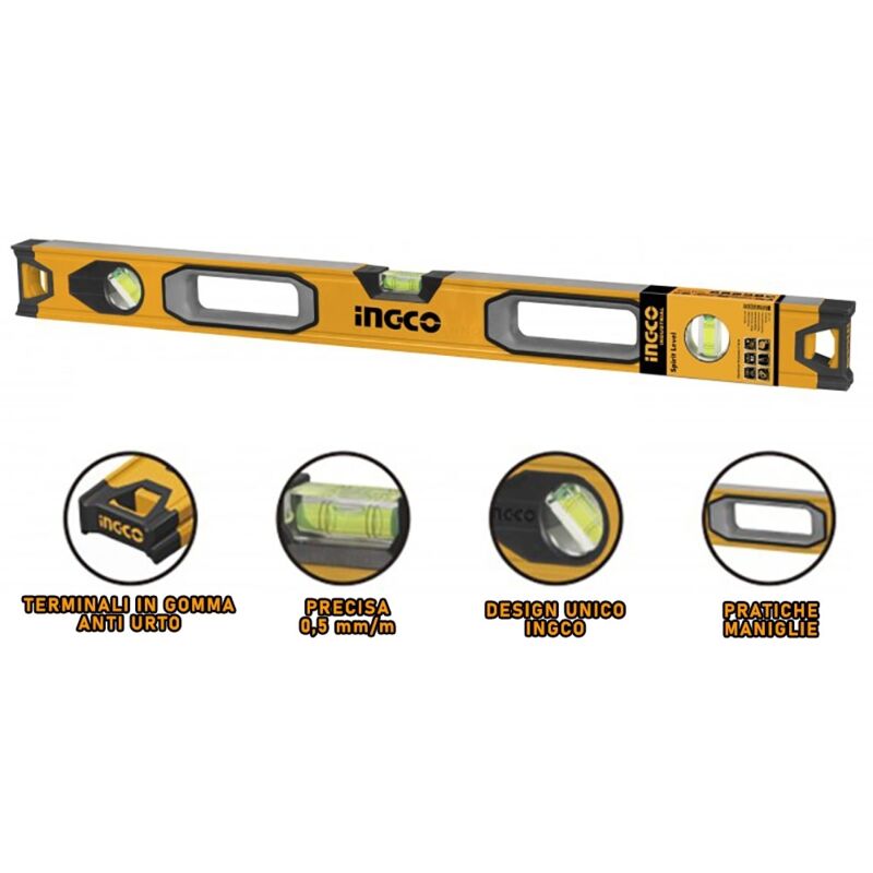 Lunghezza: 100 cm Doppio lato zigrinato 3 bolle di precisione 0,5mm/m Spessore alluminio: 1,5mm Scanalatura a V per misurazione oggetti a forma tonda