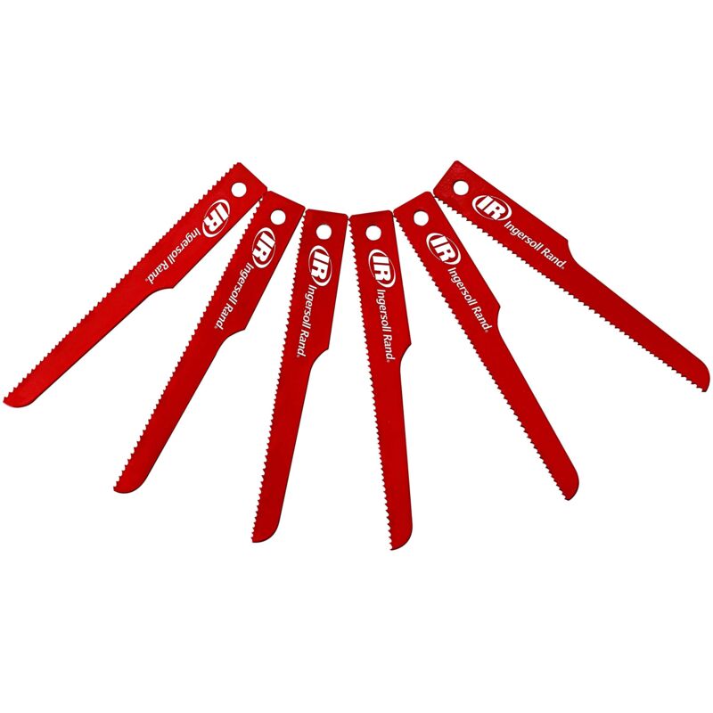 Confezione da 6 lame per sega alternativa pneumatica a passo variabile grosso - 14/18 TPI. Le lame per seghe Bi-Metal Ingersoll Rand migliorano complessivamente le prestazioni di taglio. La tecnologia Bi-Metal è un processo di diffusione allo stato solido che applica acciaio ad alta velocità su entrambi i bordi del materiale di supporto, aumentando l'area di contatto della lama del 170%. Questo, insieme a un nuovo profilo del dente che genera trucioli più piccoli ma più numerosi, riduce il calore di attrito generato durante il processo di taglio, migliorando le prestazioni complessive della lama. Le lame per sega Ingersoll Rand possono essere utilizzate con tutte le seghe alternative pneumatiche standard con gambo da 1/2.