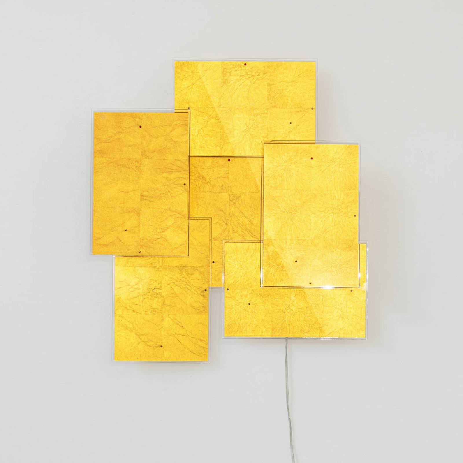 Lusso per la parete - lampada da parete di design 24 Karat Blau Flat in foglia d'oroLa lampada 24 Karat Blau Flat è letteralmente un pezzo d'oro per la parete. Questa lampada da parete è un altro membro della famiglia 24 Karat Blau che porta il lusso in casa. Il paralume è costituito da un pannello di vetro acrilico racchiuso in una sottilissima foglia d'oro battuta ed è montato piatto sulla parete di fronte alla sorgente luminosa. La luce viene diretta lateralmente e in modo molto discreto attraverso il pannello dorato, creando un'atmosfera lussuosa e priva di abbagliamenti. Per il design individuale della parete e della lampada, è possibile acquistare moduli aggiuntivi (vedi accessori) e diventare co-designer della lampada da parete 24 Karat Blau Flat. I moduli aggiuntivi possono essere affiancati al modello base secondo il proprio gusto e creare così una lampada da parete unica nel suo genere! Per un progetto più ampio di 6 o 7 moduli aggiuntivi, si consiglia un secondo "modulo base".Questa serie di lampade è opera del designer Axel Schmid, che fa parte del team creativo di Ingo Maurer da molti anni e ha sviluppato anche i modelli precedenti della serie.