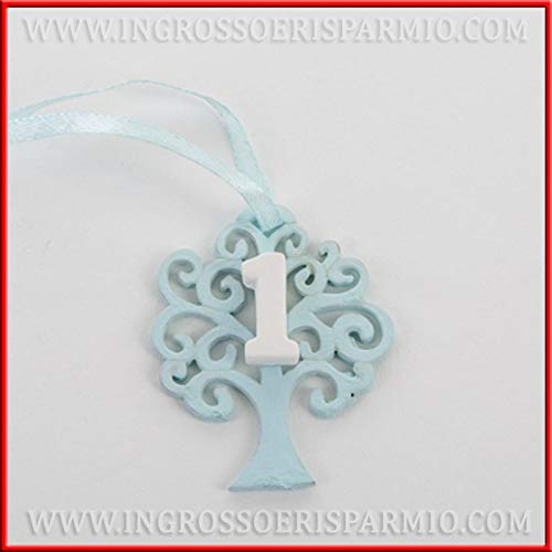 Ingrosso e Risparmio 10 Legnetti a Forma di Albero appendino in Legno Azzurro con nastrino e gessetto Numero 1, Idee economiche per Primo Compleanno Maschio (con Confezione Celeste)