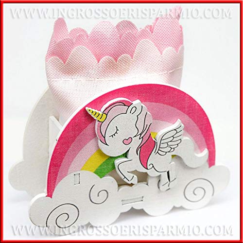 Ingrosso e Risparmio 6 Portaconfetti a Forma di Arcobaleno con Unicorno Rosa in Legno e sacchettino per Confetti, Idee pensierini, bomboniere Nascita Bambina (con Confetti Bianchi)