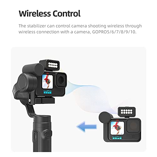 【Controllo wireless】 Lo stabilizzatore può controllare le riprese della fotocamera in modalità wireless tramite connessione wireless con una fotocamera, GOPRO 5/6/7/8/9/10. NOTA: insta360 one R, Osmo action e altre action cam possono essere adattate fisicamente, ma il controllo wireless non è supportato.