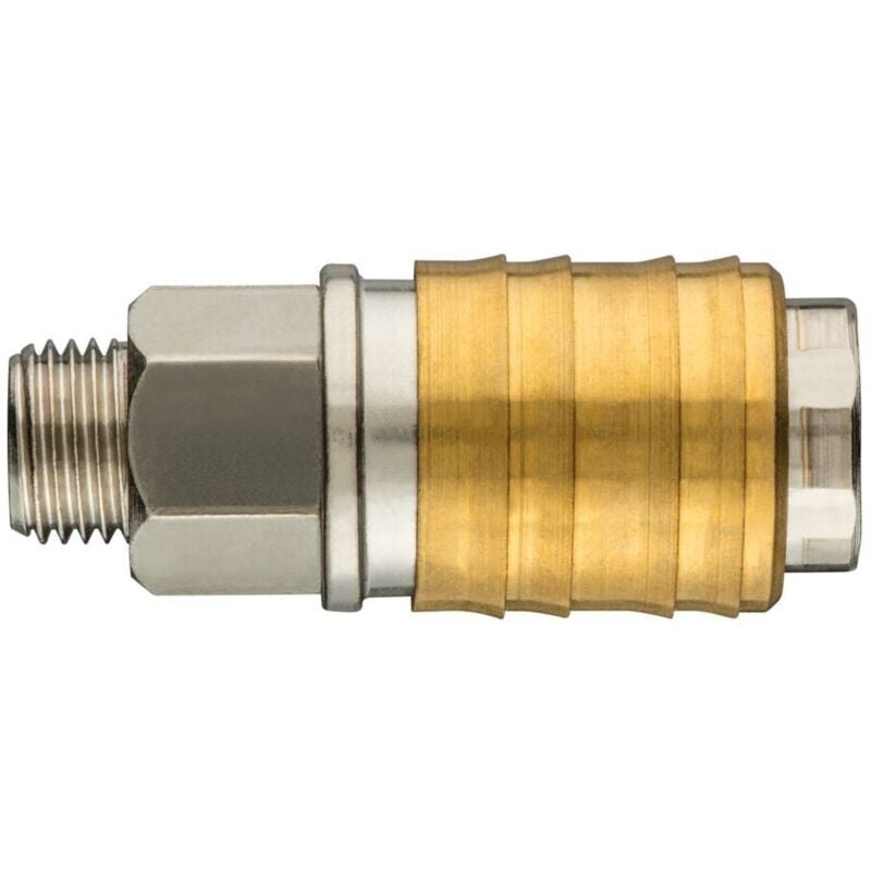 Attacco rapido per compressore realizzato in acciaio inossidabile e ottone di alta qualità. Pressione massima di esercizio 16 bar. Il prodotto è contrassegnato con il marchio CE, che conferma la conformità alle linee guida di sicurezza.