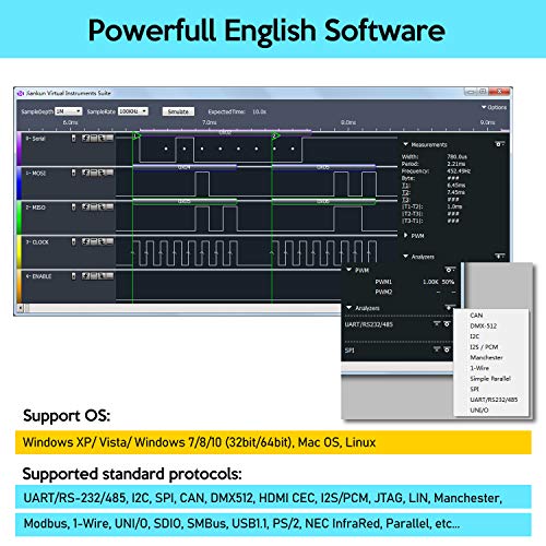 Supported standard protocols: UART/RS-232/485, I2C, SPI, CAN, DMX512, HDMI CEC, I2S/PCM, JTAG, LIN, Manchester, Modbus, 1-Wire, UNI/O, SDIO, SMBus, USB1.1, PS/2, NEC InfraRed, Parallel, etc.