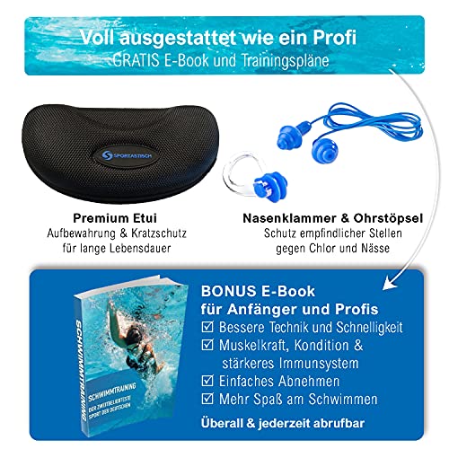 Innovativi occhialini nuoto Premium "SwimStar" di Sportastisch::100% protezione UV e rivestimento antiappannamento::stringinaso & tappi orecchie INCLUSI:: occhialini piscina ideali per principianti o professionisti::chiusura rapida "o-click"::fasce elastiche regolabili in 4 modi:: garanzia 3 anni (forma V)