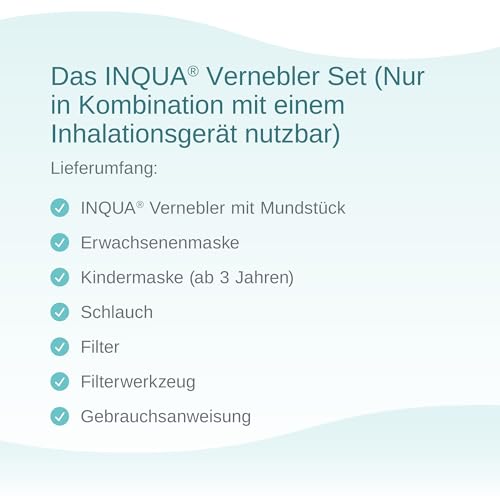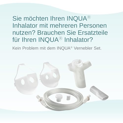 ACCESSORI INALATORI: vuoi utilizzare il tuo inalatore Inqua con più persone? Hai bisogno di pezzi di ricambio per il tuo inalatore Inqua Nessun problema con il set nebulizzatore Inqua con bocchino e tubo di collegamento, maschera per adulti e bambini, filtro dell'aria, strumento per il cambio del filtro