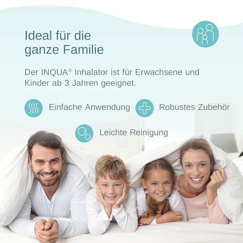 Per tutta la famiglia: l'uso dell'inalatore Inqua è molto semplice ed è adatto anche per anziani e bambini. Tuttavia, per motivi igienici, ogni persona dovrebbe usare il proprio nebulizzatore con boccaglio e maschera