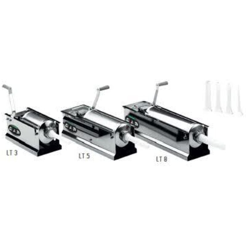 Insaccatrice manuale in acciaio inox mod kg 8 a 2 velocita' Insaccatrice di grande robustezza avente struttura portante compatta in acciaio. Meccanismo ed ingranaggeria di riduzione e di moltiplicazione della corsa dello stantuffo in metallo, per agevolare rispettivamente le operazioni di insaccatura e di estrazione dello stantuffo. Tubo in acciaio inox AISI 304 specifico per alimenti, cremagliera in acciaio, supporto per lo stantuffo in nylon, coperchio e guarnizione dello stantuffo in materiale plastico specifico per alimenti. Viene fornito di serie con quattro imbuti insaccatori di varie dimensioni per tutti i tipi di insaccati. Caratteristiche: Capacita' lt 6,8 Velocita' 2 Dimensioni cm 70x22x22 h Peso Kg 15 Qualita' italiana del made in Italy In negozio sono disponibili altri prodotti e accessori di casalinghi. Per maggiori informazioni non esitare a contattarci.
