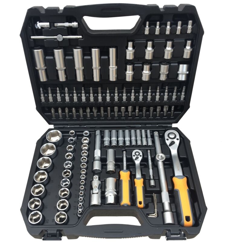 Kit composto da 3 cricchetti 1/2 - 1/4, un adattatore/cacciavite porta inserti e barre a T scorrevoli corredate da centinaia di inserti e bussole dalle molteplici impronte. Bussole lunghe, corte, inserti torx, esagonali, ribe di qualsiasi dimensione. Un