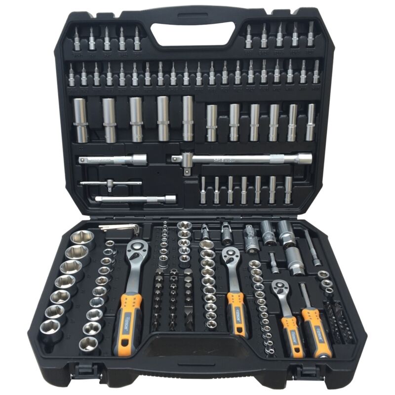 Kit composto da 3 cricchetti 1/2 - 3/8 - 1/4, un adattatore/cacciavite porta inserti e barre a T scorrevoli corredate da centinaia di inserti e bussole dalle molteplici impronte. Bussole lunghe, corte, inserti torx, esagonali, ribe di qualsiasi dimensi