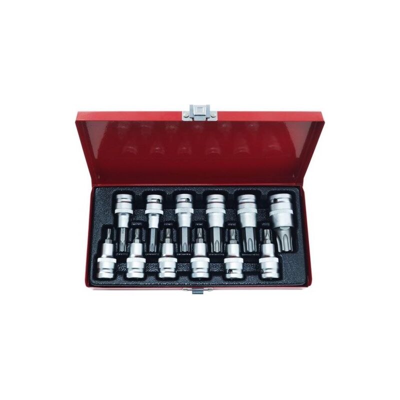 Set chiave a Bussola Torx T20-T70 12Pz chrome vanadium ART.19031212 Set composto da 12 inserti TORX con attacco 1/2. CHIAVI A BUSSOLA TORX T20-T80 CHROME VANADIUM 13 PEZZI IL SET CONTIENE: 12 PEZZI T20-T25-T27-T30-T35 T40-T45-T50-T55-T60 T70-T80. Contenuto della confezione Valigia in metallo con 12 inserti