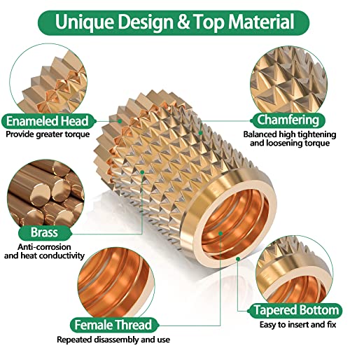 【Dadi robusti e durevoli】: gli inserti filettati femmina sono realizzati in ottone di altissima qualità, che può garantire la migliore resistenza alla corrosione e conduttività termica. Le buone prestazioni rendono ogni dado zigrinato da inserire rapidamente e la precisa filettatura femmina rende facile ogni serraggio e allentamento. Se il tuo progetto non necessita più dei dadi inseriti, puoi anche utilizzare lo stesso metodo di riscaldamento per rimuovere i dadi zigrinati e riutilizzarli.