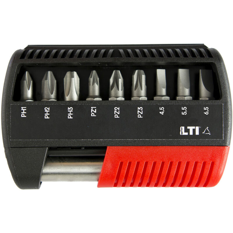 Modello MYBIT10 in astuccio di plastica con coperchio. Composto da: - 3 inserti piatti - 3 inserti a croce - 3 inserti pozidriv - 1 portainserti magnetico