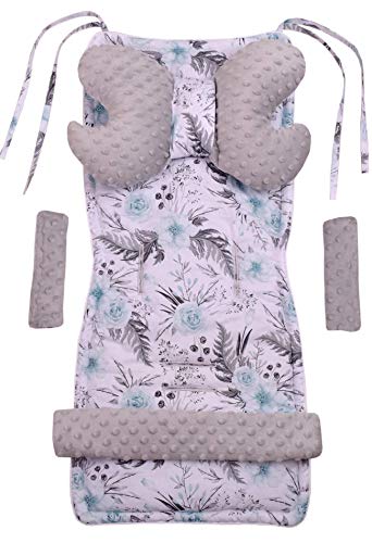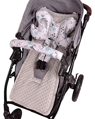 Inserto universale per passeggino per carrello a 5 elementi protezione della cintura + protezione della fascia Cotone Minky Medi Partners (Fiori con il grigio Minky)