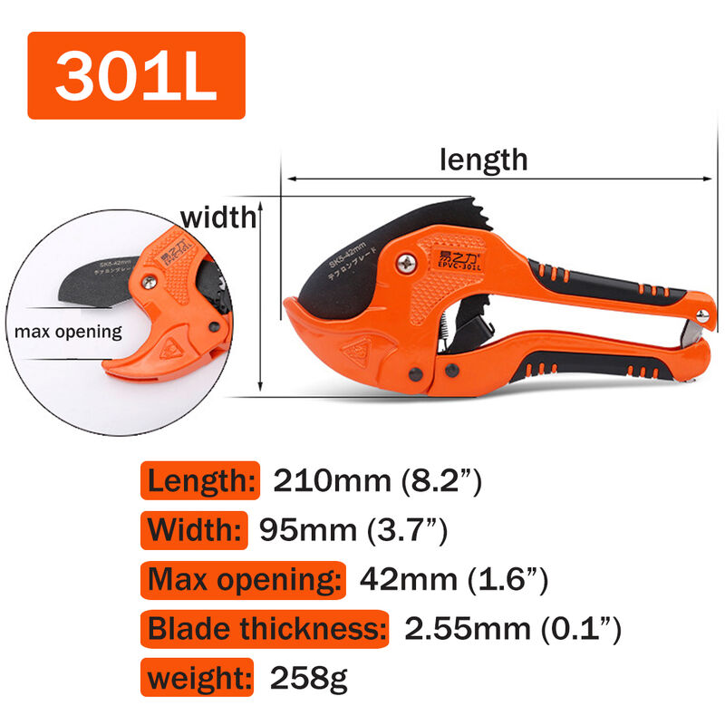 Caratteristiche:Materiale: acciaio SK5Colore arancioneLunghezza: 210 mm (8,2 pollici)Larghezza: 95 mm (3,7 pollici)Apertura massima: 42 mm (1,6 pollici)< br>Spessore lama: 2,55 mm (0,1 pollici)Peso: 258 gCaratteristiche:- Ideale per tubi in PVC, CPVC, PEX, polibutilene, polietilene, gomma e la maggior parte dei tubi non metallici .- L'azione a cricchetto taglia uniformemente e con il minimo sforzo.- Tagli veloci e piatti senza sbavature.Il pacchetto include:1 taglierina
