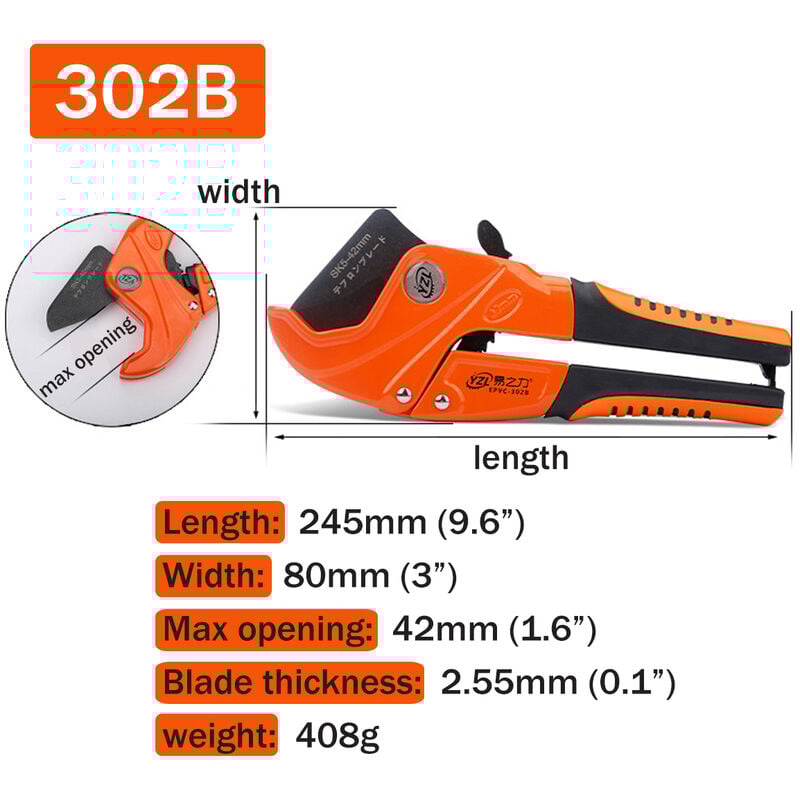 )< br>Spessore lama: 2,55 mm (0,1 pollici)Peso: 408 gCaratteristiche:- Ideale per tubi in PVC, CPVC, PEX, polibutilene, polietilene, gomma e la maggior parte dei tubi non metallici .- L'azione a cricchetto taglia uniformemente e con il minimo sforzo.- Tagli rapidi e piatti senza sbavature.< br>Il pacchetto include:1 taglierina
