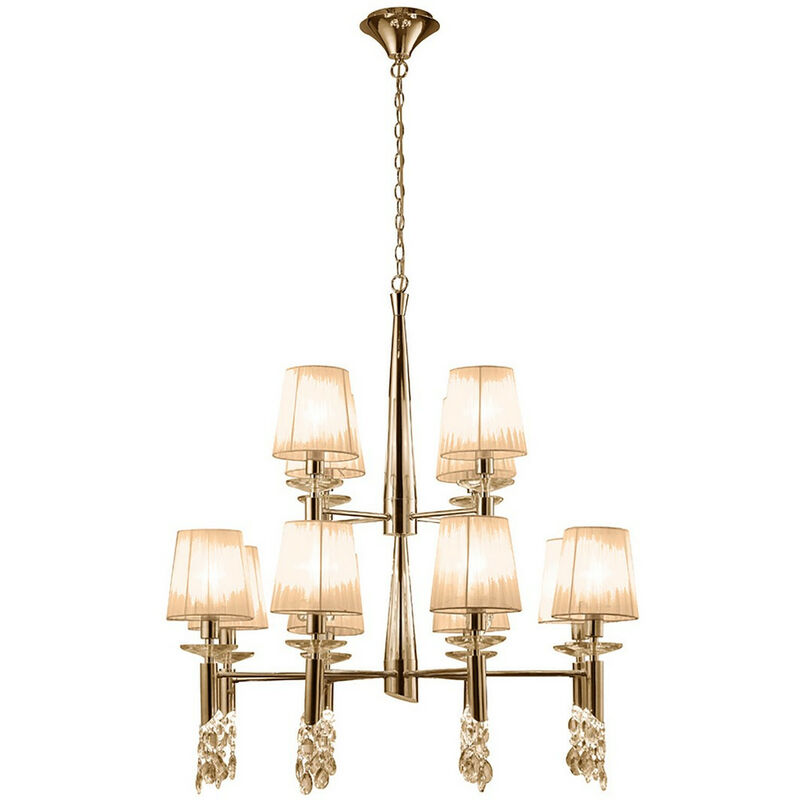 Inspired Mantra Fusion Tiffany Ciondolo Tiffany a 2 livelli 12+12 luci E14+G9, oro francese con morbide sfumature in bronzo e cristallo trasparente | Finitura: oro francese | Materiale: cristallo trasparente K9 | Classificazione IP: IP20 | Altezza minima: 90 cm | Altezza massima: 190 cm | Diametro: 85 cm | Tipo di lampada: E14 | N. di lampade: 12 | Lampadina inclusa: No | Dimmerabile: Sì - Lampade dimmerabili richieste | Peso: 11,2 kg | Potenza (massima): 15W