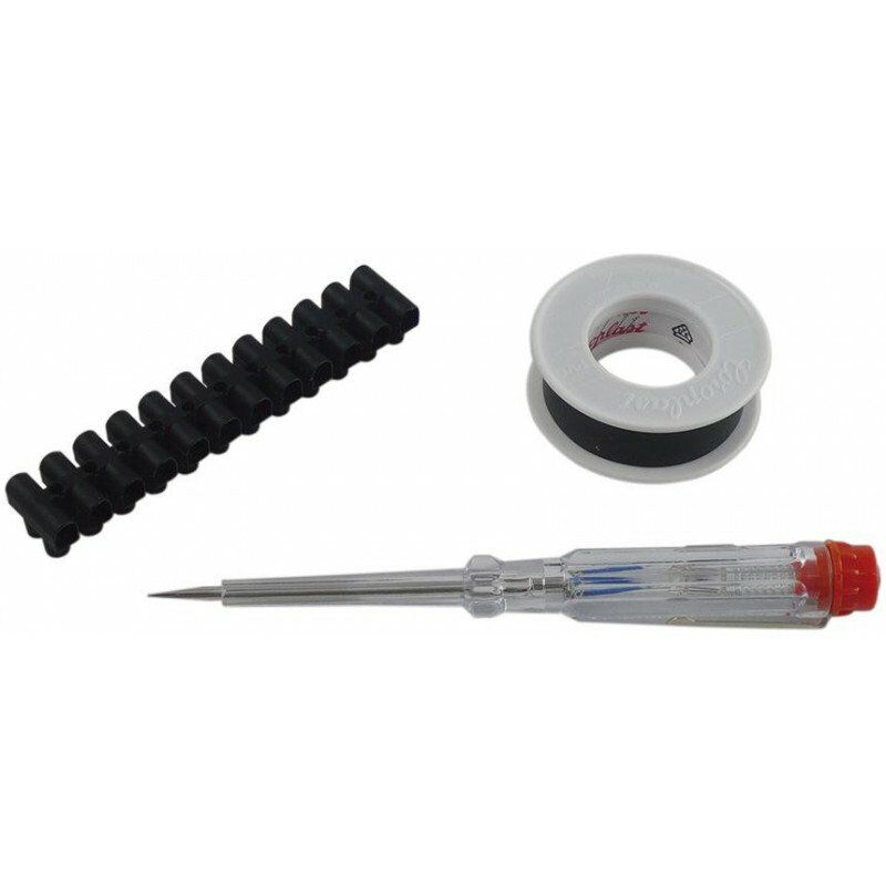 Set di installazione del tester di tensione 3pcs. • Contenuto: Nastro isolante tester di tensione e morsetto per lampadario • Tester di tensione: • Intervallo di tensione: 100 - 250 V~ • Larghezza lama: 3 mm • Morsetto lampadario: • Tensione nominale: 450 V~ • Campo di serraggio: Ø 25 mm² temperatura ambiente: +80°C • Nastro isolante: • 45 m • Secondo DIN EN 60454-3-1 • Ritardante di fiamma • Resistente all'età • Resistente alla temperatura alternata • Conservazione: da +5° C a +35° C a secco • Materiale morsetto lampadario: acciaio PP acciaio stagnato cromato • Materiale nastro isolante: film portante in PVC con adesivo acrilico