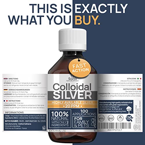Institut Katharos, Argento Colloidale Puro 20 PPM 1000 mL ● Per la famiglia & gli Animali (Cani, Gatti) ● 100% Naturale: Certificato Cosmos Natural ● Carbon Neutral
