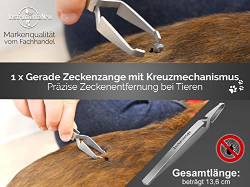 1 pinza dritta per zecche con meccanismo a croce. La lunghezza totale è di 13,6 cm, la testa della pinzetta è larga 4 mm