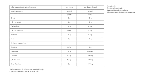 Contiene aminoacidi ramificati nel complesso 4:1:1 e creatina per supportare la crescita muscolare