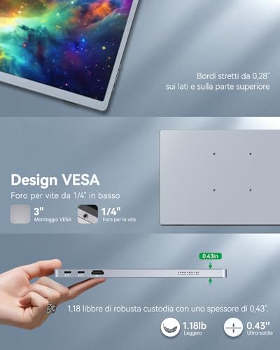 [ ] Questo monitor portatile di fascia alta presenta una cornice ultra-sottile, un peso ultra-leggero e un corpo ultra-sottile. L'involucro è realizzato in alluminio con finitura anodizzata grigio spazio. Le linee pulite e la forma discreta consentono di concentrarsi maggiormente su ciò che viene visualizzato sullo schermo. L'aspetto complessivo aggiunge un tocco high-tech alla scrivania. Ideale per gli utenti che puntano sulla praticità.