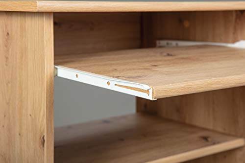 In pannello MDF rivestito in melamina. Ripiano estraibile per la tastiera con guide in metallo. Dotata di quattro ruote in plastica e bordi frontali stondati tranne quello in basso. Colore: Effetto rovere Artisan. Montaggio con attrezzi
