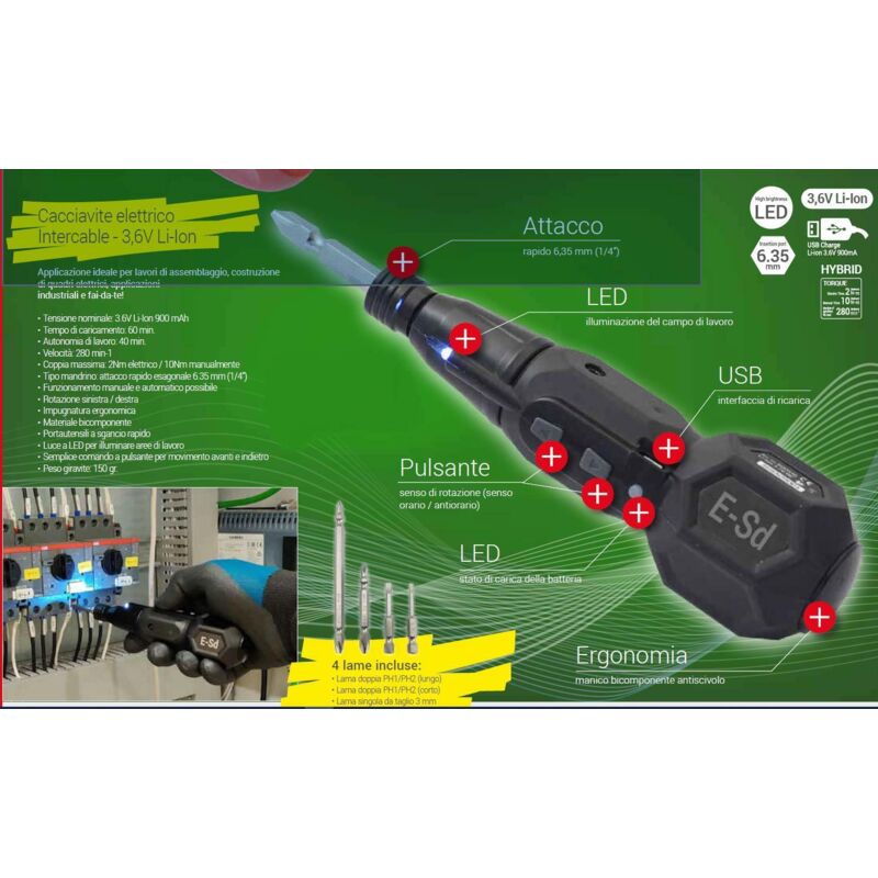 Cacciavite elettrico con lame cambiabili Tensione nominale: 3.6V Li-Ion 900 mAh Tempo di caricamento: 60 min Autonomia di lavoro: 40 min Velocità: 280 gir/min Tipo di attacco: attacco rapido esagonale 6.35 mm (1/4") Possibilità di utilizzo sia in manuale che automatico Rotazione a destra o sinistra Impugnatura ergonomica Dotato di porta utensili a sgancio rapido Dotato di luce led per illuminare area di lavoro Peso giravite: 150 gr 4 lame incluse Clicca su descrizione per altre informazioni Dotato di 4 lame incluse: Lama doppia PH1/PH2 (lungo) Lama doppia PH1/PH2 (corto) Lama singola da taglio 3 mm Lama singola da taglio 4 mm