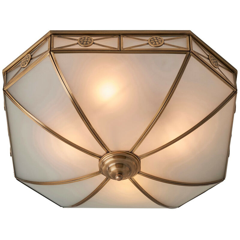 Interiors 190004FL50 - Plafoniera a filo soffitto a 4 luci in ottone antico, vetro satinato, attacco E27 | Finitura: ottone antico, vetro satinato | Classificazione IP: IP20 | Lunghezza (cm): 50 | Larghezza (cm): 50 | Sporgenza (cm): 16 | No. di luci: 4 | Tipo di lampada: E27 | Lampadina: incandescente | Dimmerabile: Sì | Potenza (max): 60 | Classe: 1 (con messa a terra)