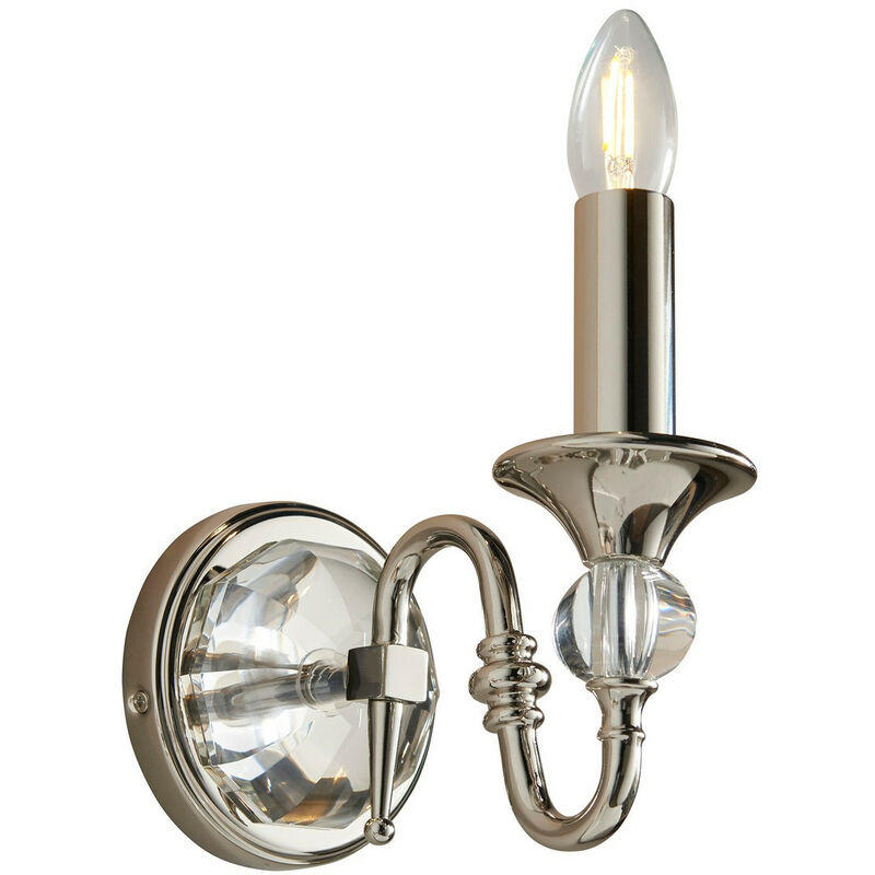 Interiors - Lampada da parete a 1 candela per interni, nichel lucido con cristallo, E14 | Finitura: cristallo trasparente, nichel lucido | Classificazione IP: IP20 | Altezza (cm): 27,5 | Larghezza (cm): 13 | Sporgenza (cm): 20,5 | Numero di luci: 1 | Tipo di lampada: E14 | Lampadina: incandescente | Dimmerabile: Sì | Potenza (max): 40 | Lampadina inclusa: no